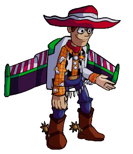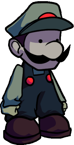 A charming cartoon character, sporting overalls, a hat, and a mustache, stands idly, adding a whimsical touch.