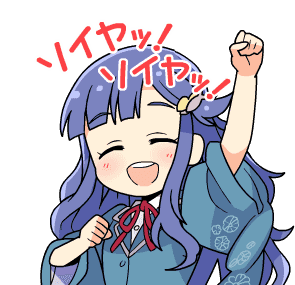 A happy Idolmaster Imas chibi girl with purple hair smiles and cheers energetically.