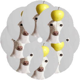 Iggy, the dog from 'My Orbs', balances a yellow apple on his head in this mesmerizing circular animation.