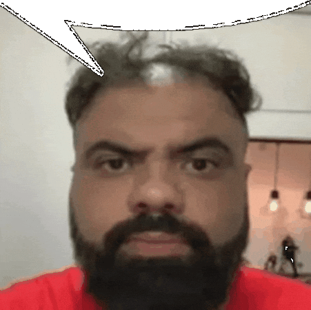 a man with a beard is making a funny face with a speech bubble above his head