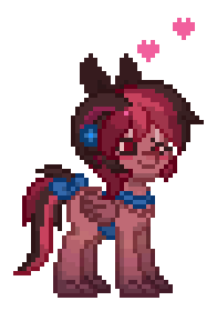 Pixel art of Ihnmaims Harlan Ellison pony character with headphones, blinking and showing hearts.
