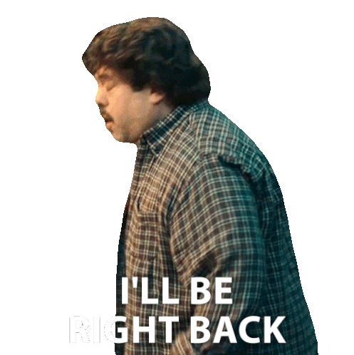 Dan Fogler in a plaid shirt says 'I'll be right back', a perfect animated sticker for a quick pause.