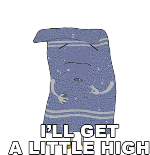 South Park's Towelie, the sentient towel, looks spaced out and says 'I'll Get A Little High' while holding a joint.