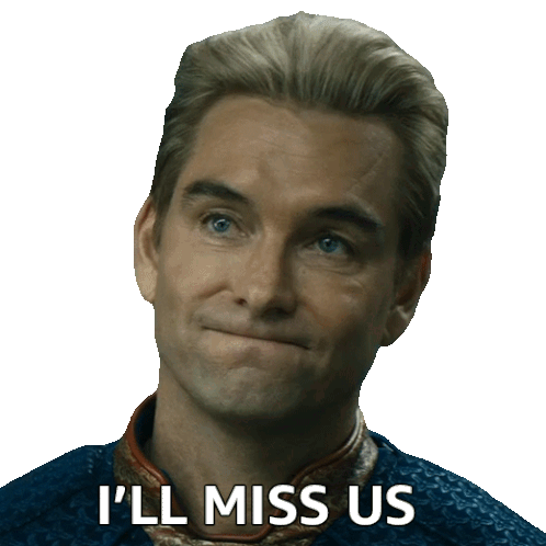 Homelander, with a slight smile and a wistful look, says 'I'll Miss Us' in his iconic superhero suit.