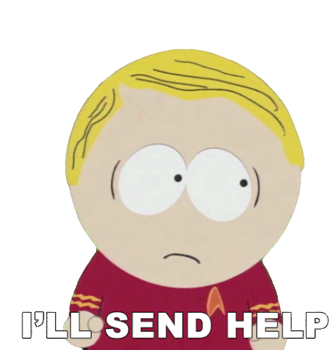 A South Park character in a red uniform looks concerned, offering assistance with the phrase "I'll Send Help."