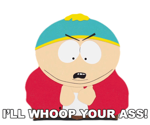 Eric Cartman from South Park, with an angry expression, declares 'I'LL WHOOP YOUR ASS!' in this animated sticker.