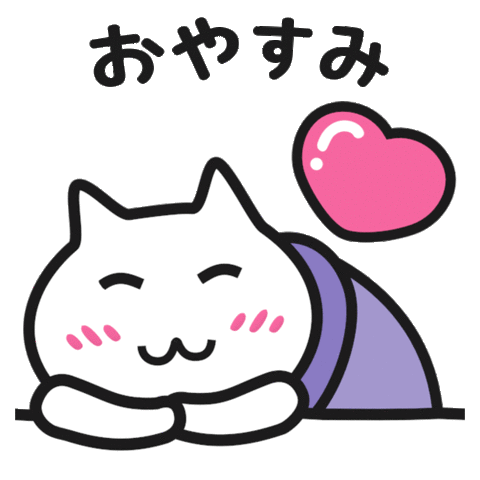 A cute white cat sticker sleeping peacefully under a blanket, with a pink heart and 'Good night' in Japanese.