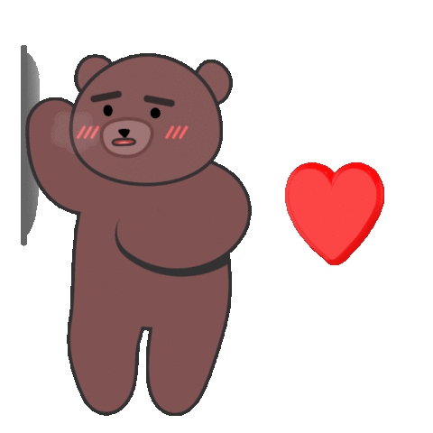 A shy brown bear blushes against a wall as a vibrant red heart appears, expressing love, affection, or a secret crush.