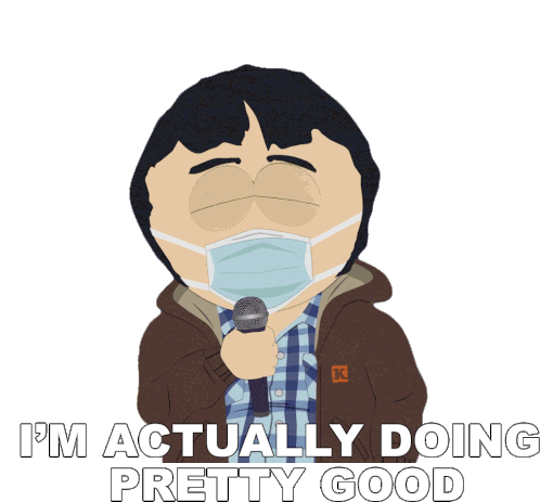 Randy Marsh from South Park, wearing a mask and holding a microphone, states "I'm actually doing pretty good."