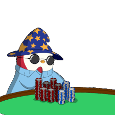 A Pudgy Penguin wizard, wearing a star-hat and glasses, pushes poker chips forward, going 'all in' at the casino table.