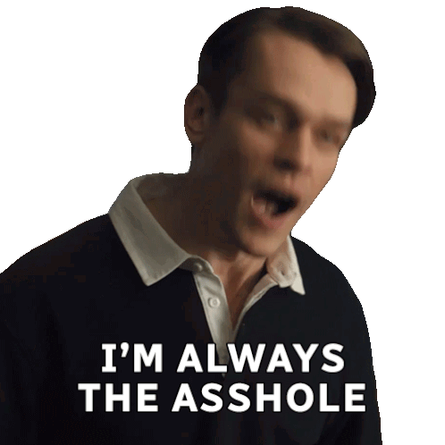 Thomas Elms as Nowak says 'I'm always the asshole' with a frustrated and resigned expression.