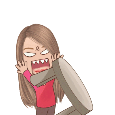 Cartoon woman with long brown hair, wearing pink, screams angrily with sharp teeth behind a table.