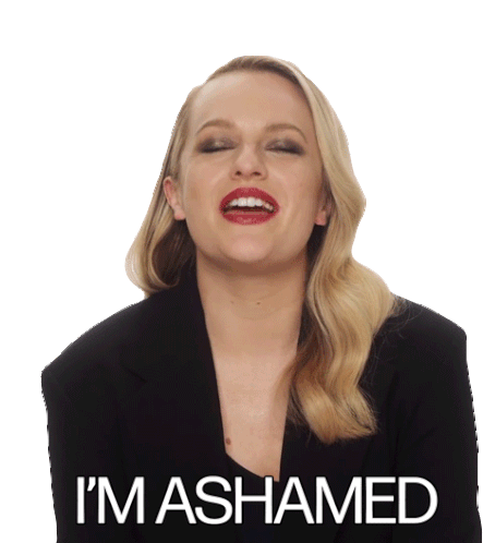 Elisabeth Moss expresses shame and regret, looking distraught and embarrassed, possibly from a Harpers Bazaar feature.
