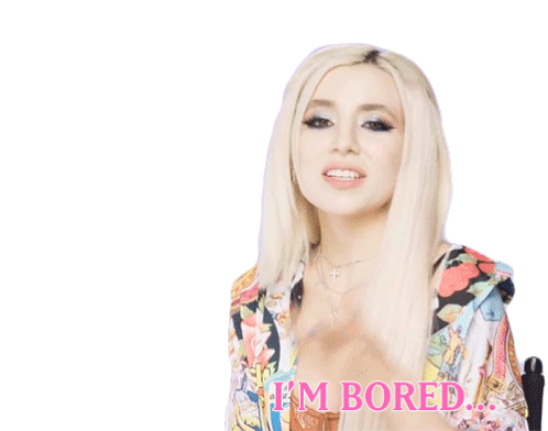 Ava Max expresses boredom with a hand gesture as the text 'I'M BORED...' appears, perfect for feeling uninspired.