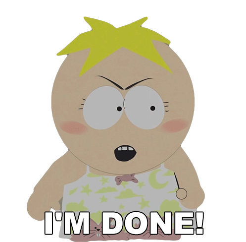 Butters Stotch from South Park, looking angry and frustrated, declares 'I'M DONE!' in this animated sticker.