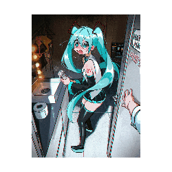 Hatsune Miku in pixel art style, holding a microphone and looking surprised in a cluttered room.