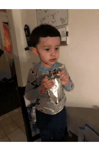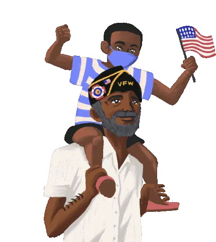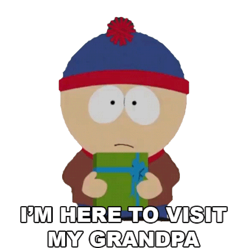 Stan Marsh from South Park holds a gift and says, 'I'm here to visit my grandpa,' in this animated sticker.