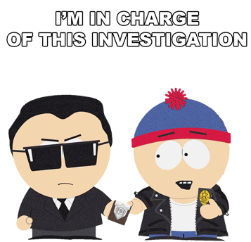Stan Marsh, alongside an FBI agent, declares 'I'm In Charge Of This Investigation' with a determined look.