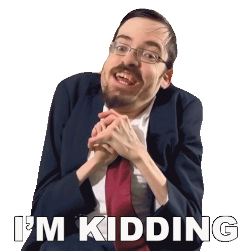 Ricky Berwick playfully says 'I'M KIDDING' with a wide smile, gesturing with his hands in a suit and tie.