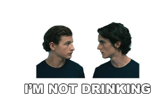 Fionn Whitehead and Tye Sheridan from Voyagers look at each other with the caption "I'M NOT DRINKING", expressing refusal.
