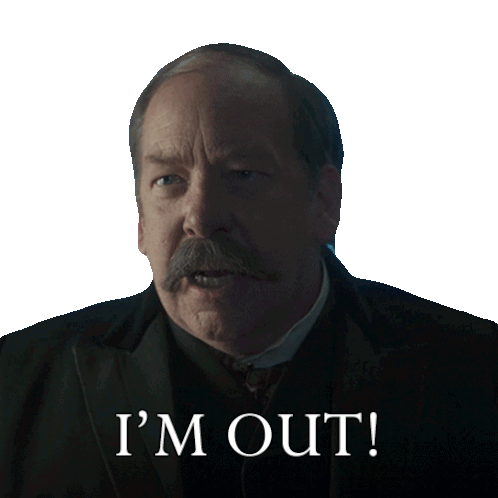 J.P. Morgan, portrayed in The Gilded Age, emphatically declares 'I'M OUT!' with a surprised expression.
