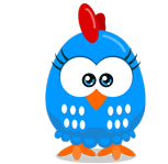 Galinha Pintadinha, the blue cartoon chicken, waves goodbye and flies off, signifying 'I'm Out' or leaving.