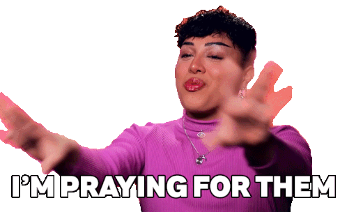 Morphine Love Dion from RuPaul's Drag Race, wearing a purple top, gestures with open hands and says 'I'm praying for them'.