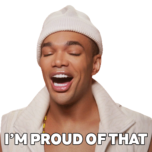 Kahanna Montrese from RuPaul's Drag Race proudly declares 'I'M PROUD OF THAT' with a confident smile.