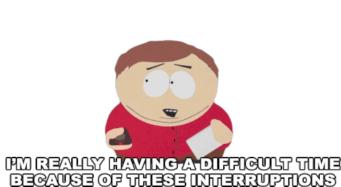 Eric Cartman expresses frustration, stating he's having a difficult time due to constant interruptions.