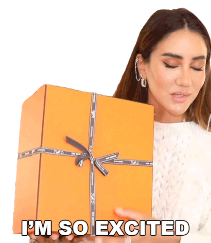 Tamara Kalinic joyfully holds an orange gift box, expressing her immense excitement. Perfect for sharing happy news.