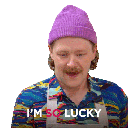 Nigel from The Great Canadian Baking Show expresses his joy, saying "I'm So Lucky" with a happy smile.