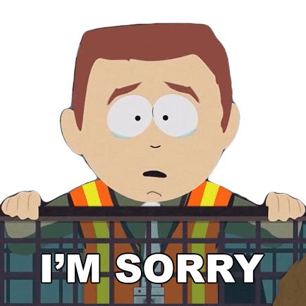 Stephen Stotch from South Park, looking sad and tearful in a construction vest, apologizes with the caption 'I'm Sorry'.