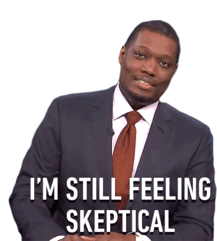 Michael Che from Saturday Night Live expresses doubt, saying 'I'm Still Feeling Skeptical' with a questioning look.