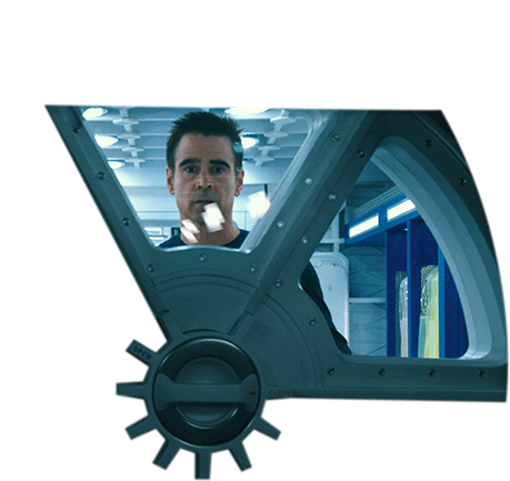 Colin Farrell, as seen in the Voyagers movie, looks intensely through a small porthole, feeling trapped. A Richard Alling sticker.