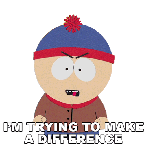 Stan Marsh from South Park expresses frustration, stating "I'm trying to make a difference." His determined expression conveys his earnest effort.