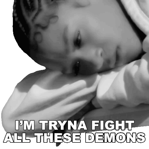 Genia, a child, rests their head with the caption 'I'M TRYNA FIGHT ALL THESE DEMONS', conveying struggle and resilience.