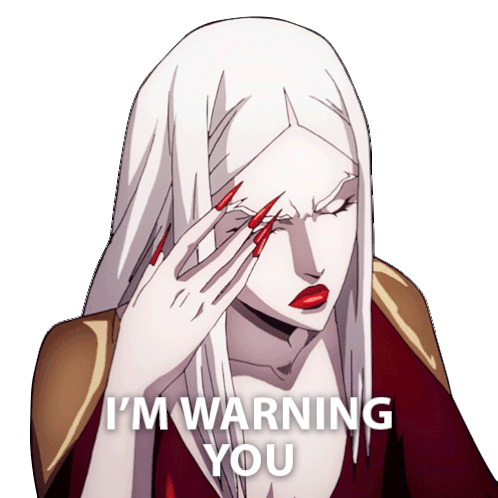 Carmilla from Castlevania, with long white hair and red nails, gives an intense "I'm Warning You" look.