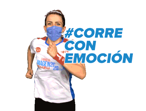 A woman in a face mask and running gear gives a double thumbs-up, promoting the "Imagen Carrera 2020" with the slogan "#CorreConEmoción."