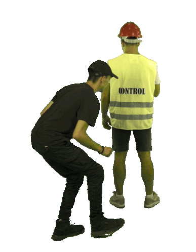 Imix and a companion are caught during urban exploration, with one wearing a 'CONTROL' vest, suggesting they've been busted.