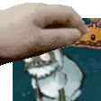 A hand holds a piece of bread in front of the animated character Imp Yeti, who reacts with curiosity.