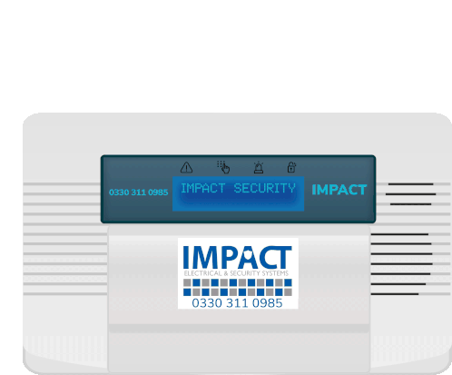An animated sticker featuring a white Impact Security alarm panel, displaying the company name, phone number, and website address.