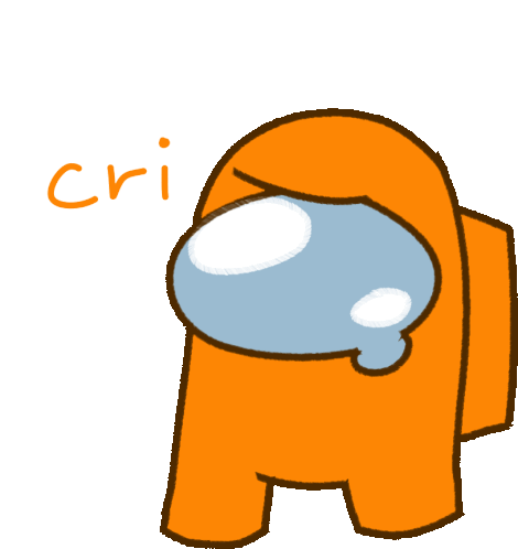 An orange Among Us imposter character, created by Sinomat, is shown crying with tears streaming down its visor.
