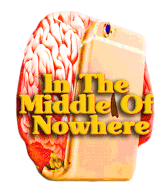 A vibrant red brain with a gold smartphone on top, featuring the text "In The Middle Of Nowhere" in yellow.