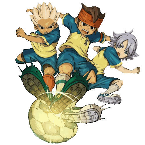 a cartoon of three soccer players with one wearing a shirt that says ' inazuma eleven ' on it