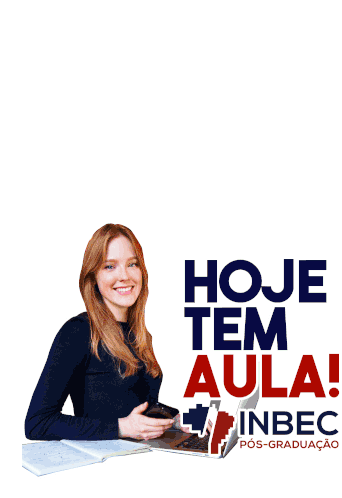 A smiling woman with a laptop and the text 'Hoje Tem Aula!' for INBEC Pós-Graduação, inviting students to class.
