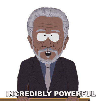 Morgan Freeman, depicted in South Park style, declares something is incredibly powerful with a serious expression.