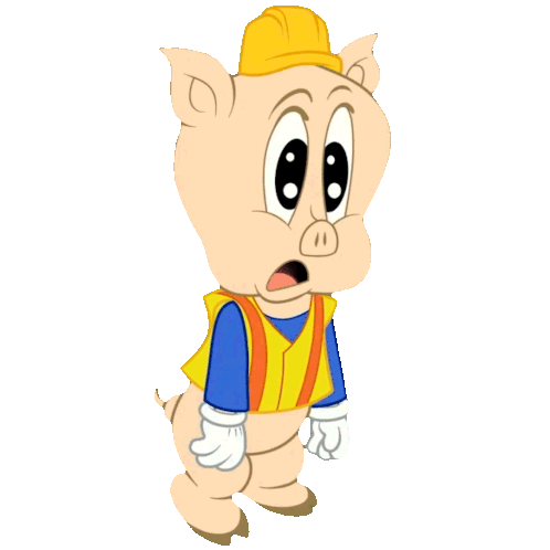 Puerco Porky, dressed as a construction worker, looks incredibly surprised with wide eyes and an open mouth.