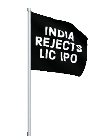 A black flag waves with the bold white text 'INDIA REJECTS LIC IPO', symbolizing public sentiment.
