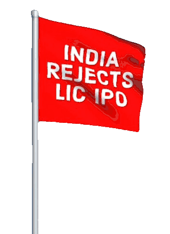 A vibrant red flag waving with the bold white text "INDIA REJECTS LIC IPO" prominently displayed.