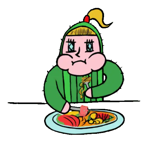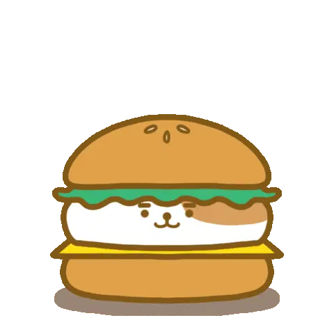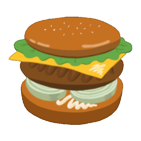 A vibrant cartoon sticker featuring a classic fast food hamburger with lettuce, cheese, patty, onions, and sauce.